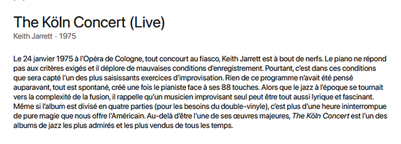 Le 24 janvier 1975, en tournée en Europe, Keith Jarrett fait étape à l’Opéra de Cologne. Contraint de jouer sur un piano en piètre état, le résultat est un concert de pure magie, entièrement improvisé, durant lequel vont s’écouler 70 minutes d'une musique céleste ininterrompue. Les cowboys fringants : Plus Rien