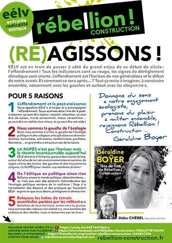 Bref, collapsos et à la gauche de l’écologie, il est cohérent que nous nous préoccupions beaucoup de l’avenir de la NUPÉS. Nous voulons qu'EÉLV soit à l’initiative, autour des luttes de terrain partout dans les territoires, de larges unions des écolos, des gauches, et des mouvements citoyens et associatifs.